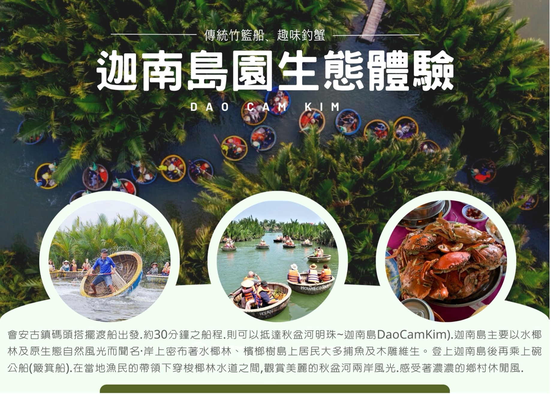 - 【會安迦南島原生態體驗】迦南島主要以水椰林及原生態自然風光而聞名。岸上密布著水椰林、檳榔樹,島上居民大多以捕魚及木雕維生。 登上迦南島後再乘上碗公船(簸箕船),在當地漁民的帶領下穿梭椰林水道之間,觀賞美麗的秋盆河兩岸風光,感受著濃濃的鄉村休閒風。放眼望去,河道裡星星點點的簸箕船,恰似秋盆河上的一道靚麗風景線。