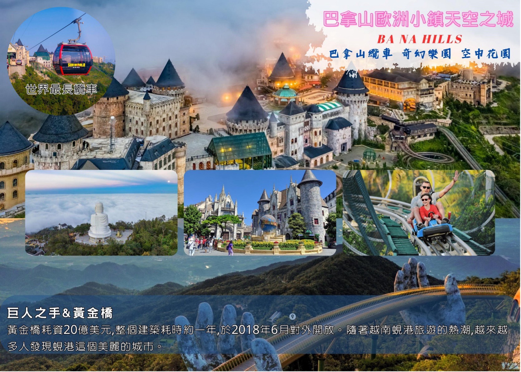 - 【法國山城巴拿山】地勢優美,素有法國春天山城之美譽!在此搭乘被列為健力士記錄的全球最長及最高不停站纜車,20分鐘直達海拔4239呎的山上。纜車剛開始攀升,腳下盡是樹林石澗溪流,10分鐘後以身處於雲海當中,眼前景像猶如身處仙境之中。法國人曾在此建立避暑區,氣候一日四季。婆納有遼闊的自然林,溪泉縱橫其間,天氣晴朗時,站在主山頂,可以看見峴港市、容橘灣、美溪海等整個寬廣空間,猶如一幅巨型山水畫。