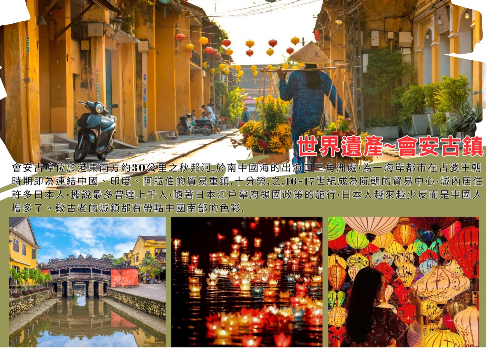 - 【世界遺產會安古城】十七世紀的古老城鎮--會安古鎮,此鎮位於峴港東南方約30KM處,為中古時代中國、印度、日本海運交易據點,因文化彙集交流,古老建築風格一直留存至,令會安古城古樸中帶點悠閒,感覺上有點像中國雲南的麗江。